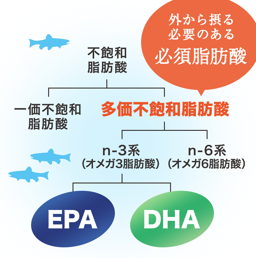 主に青魚の油に多く含まれるEPAは、体内でほとんど作ることができない「必須脂肪酸」の一種です。