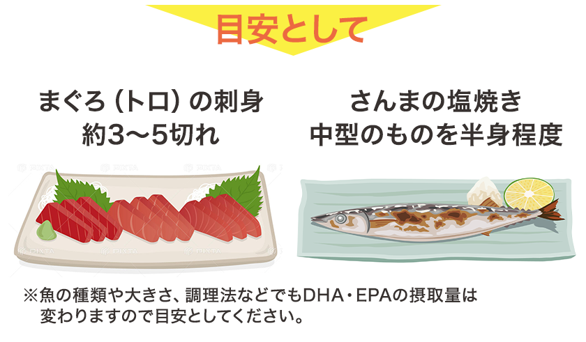 厚生労働省が発表している「日本人の食事摂取基準(2010年版)」によると、DHA・EPAの目安量は1日1000mg以上とされています